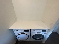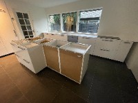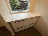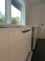 Bordplader til bryggers, hvor to bordplader er "væg-til-væg" og én bordplade med vandfald/endegavl, samt bordplade med vask og vandfald/endegavl.