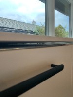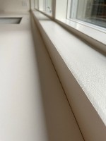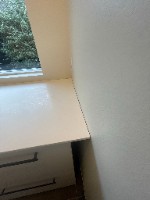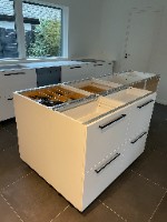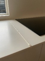 Bordplader til køkkenet består af en bordplade "væg-til-væg" på ca. 4,80 meter og en køkkenø med vandfald/endegavle (2 stk.) samt siddeplads.