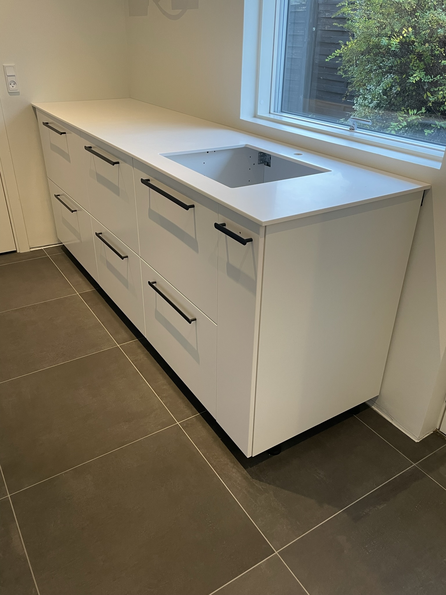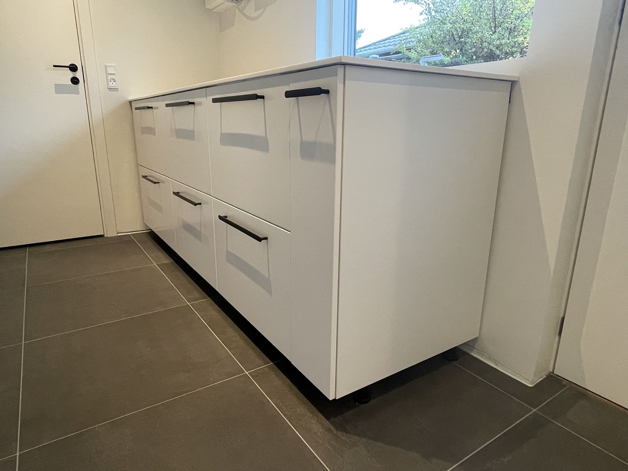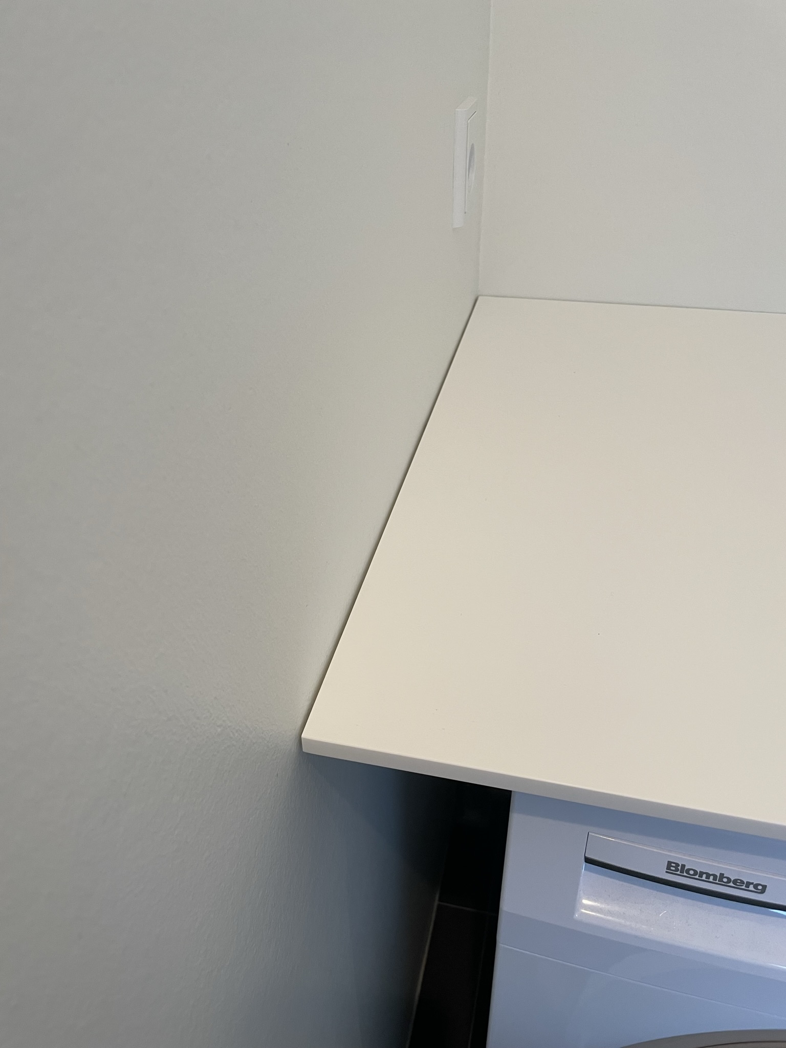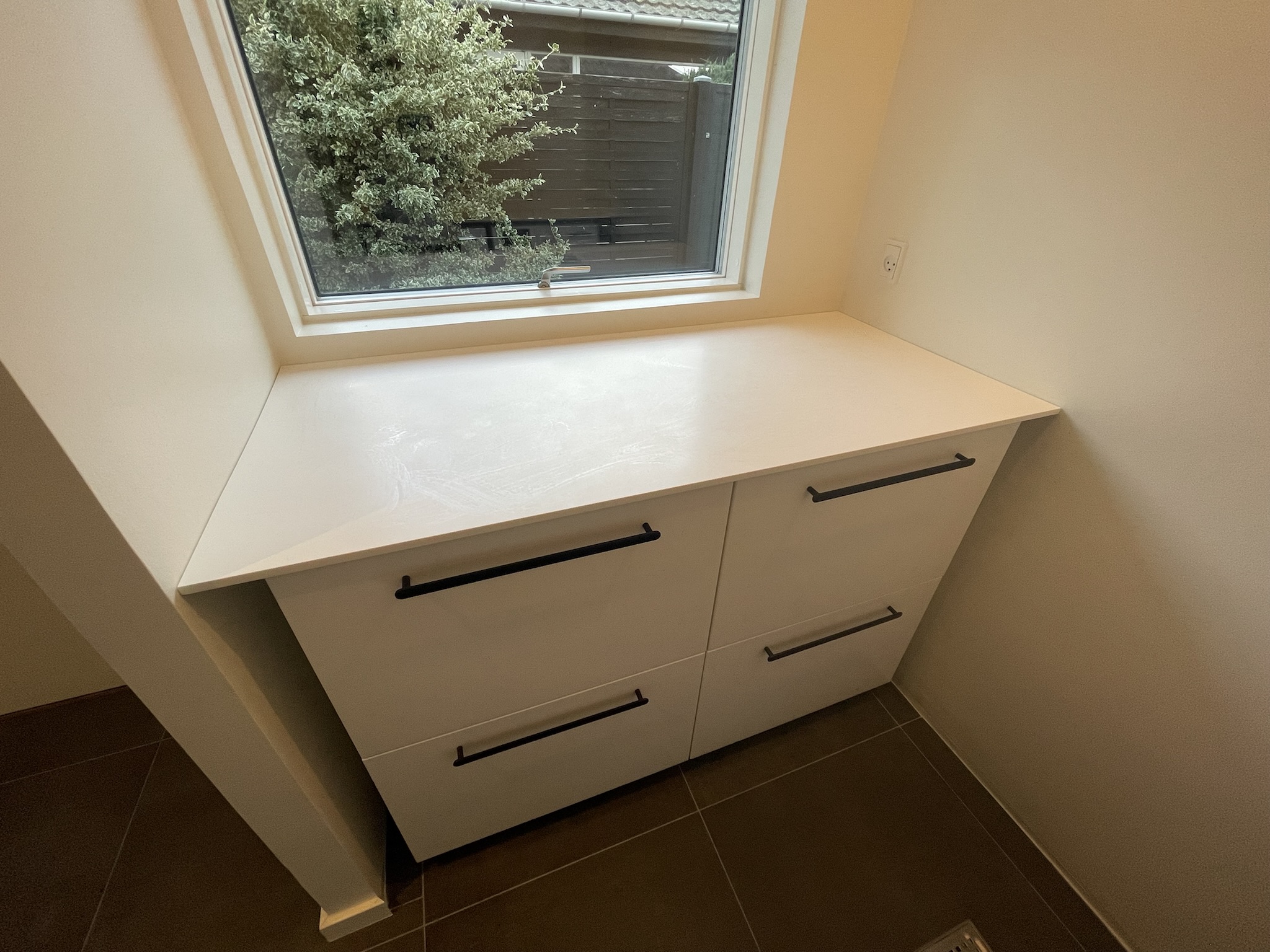 Bordplader til bryggers, hvor to bordplader er "væg-til-væg" og én bordplade med vandfald/endegavl, samt bordplade med vask og vandfald/endegavl.