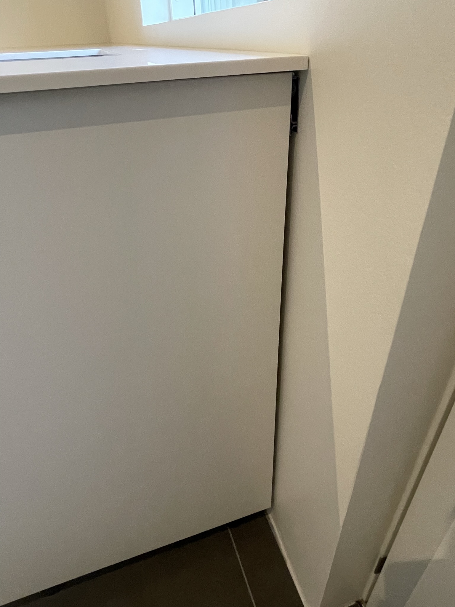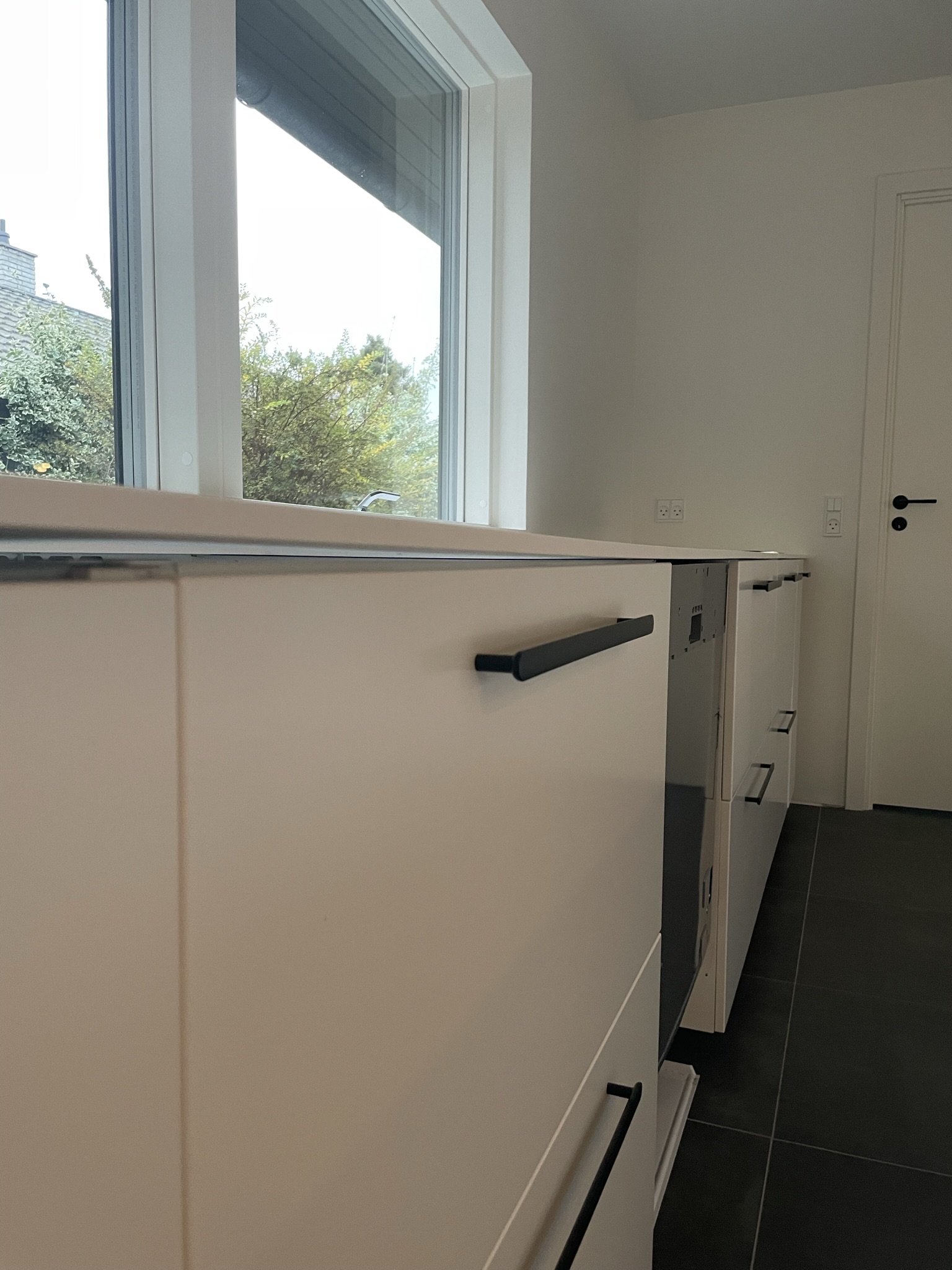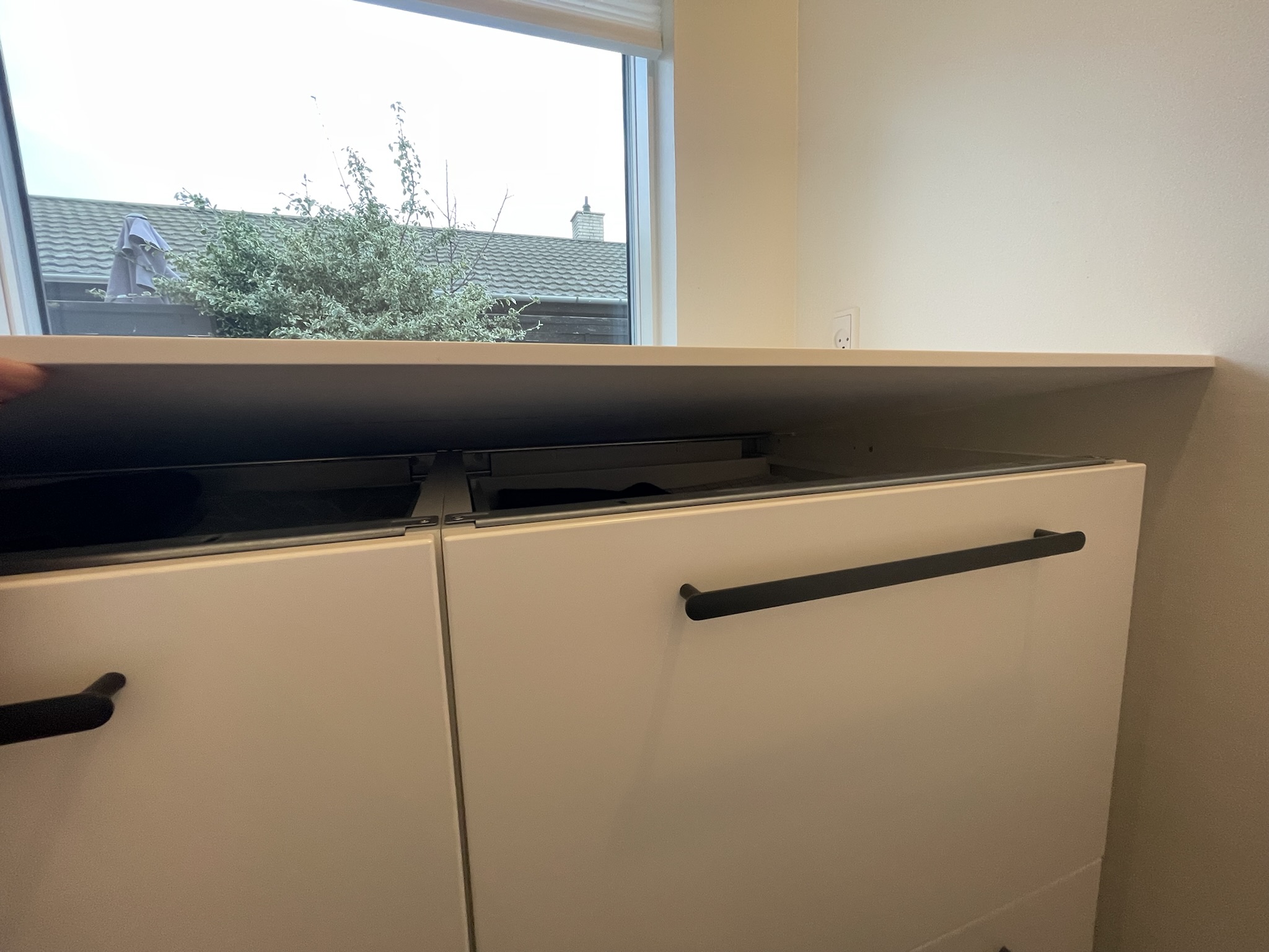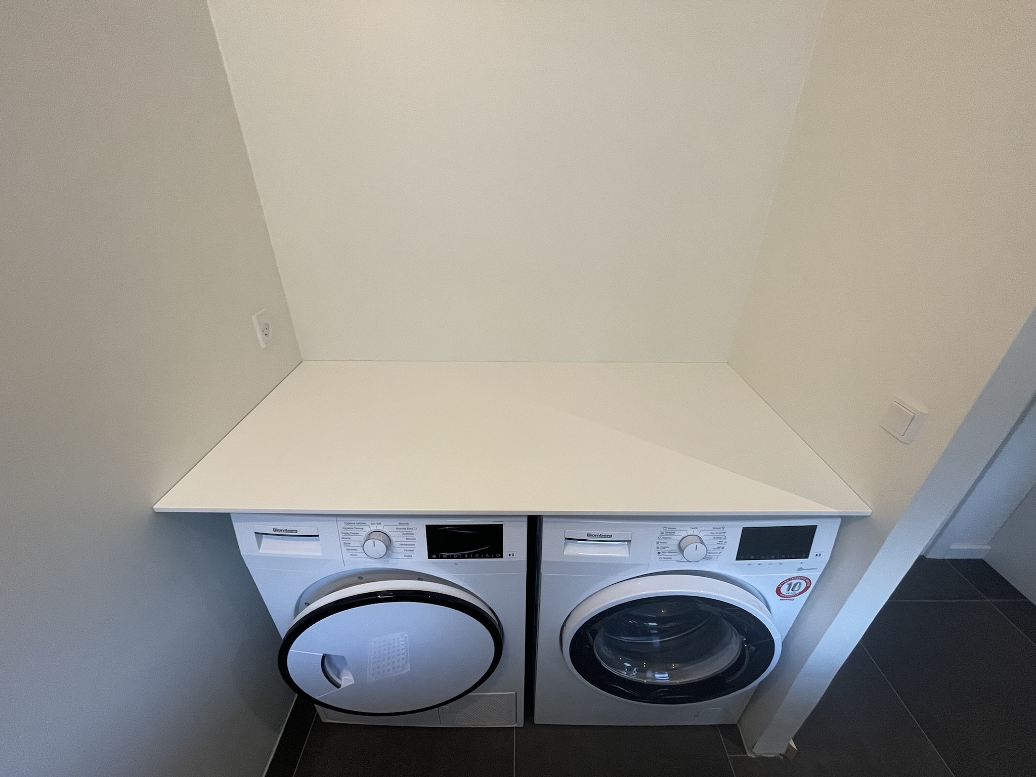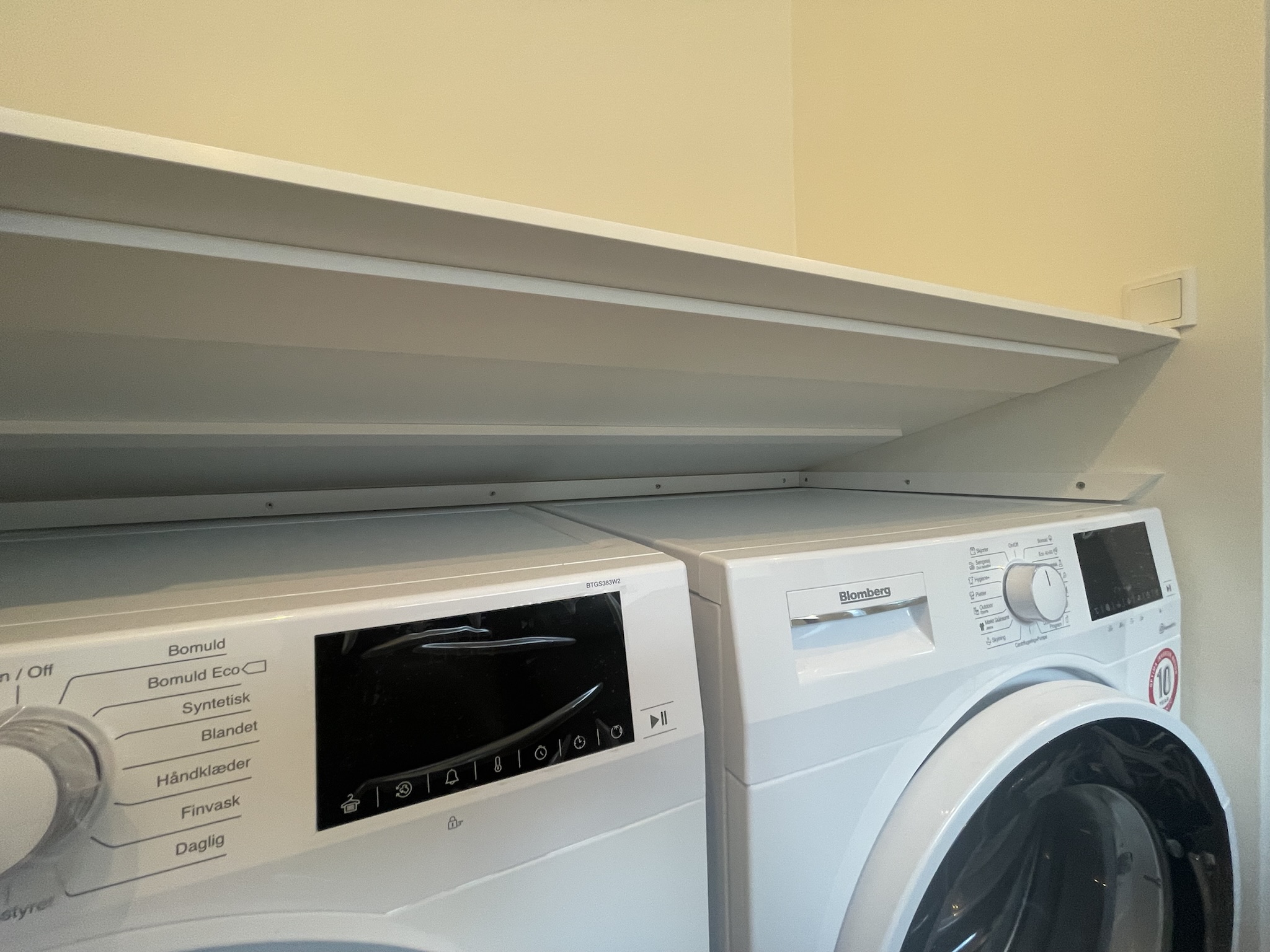 Bordplader til bryggers, hvor to bordplader er "væg-til-væg" og én bordplade med vandfald/endegavl, samt bordplade med vask og vandfald/endegavl.