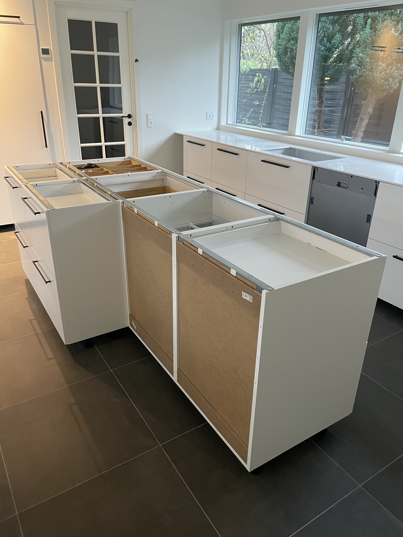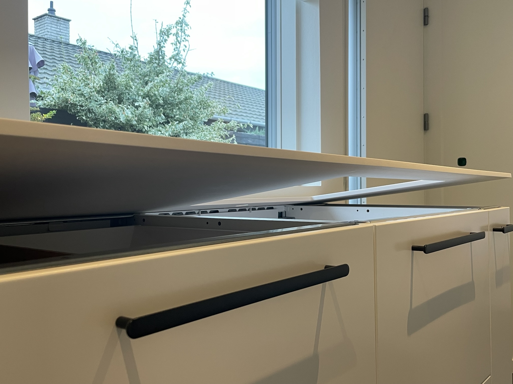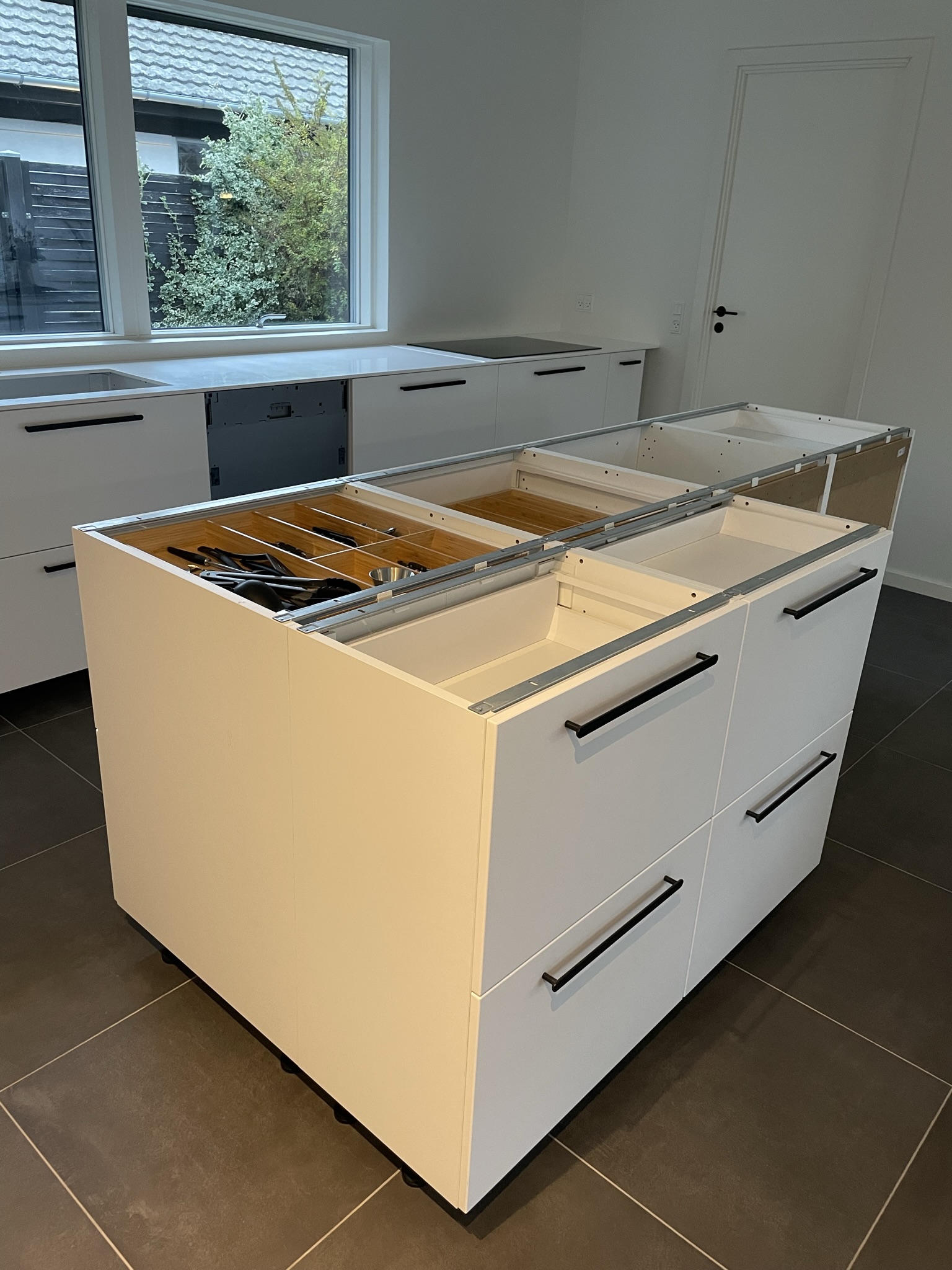 Bordplader til køkkenet består af en bordplade "væg-til-væg" på ca. 4,80 meter og en køkkenø med vandfald/endegavle (2 stk.) samt siddeplads.