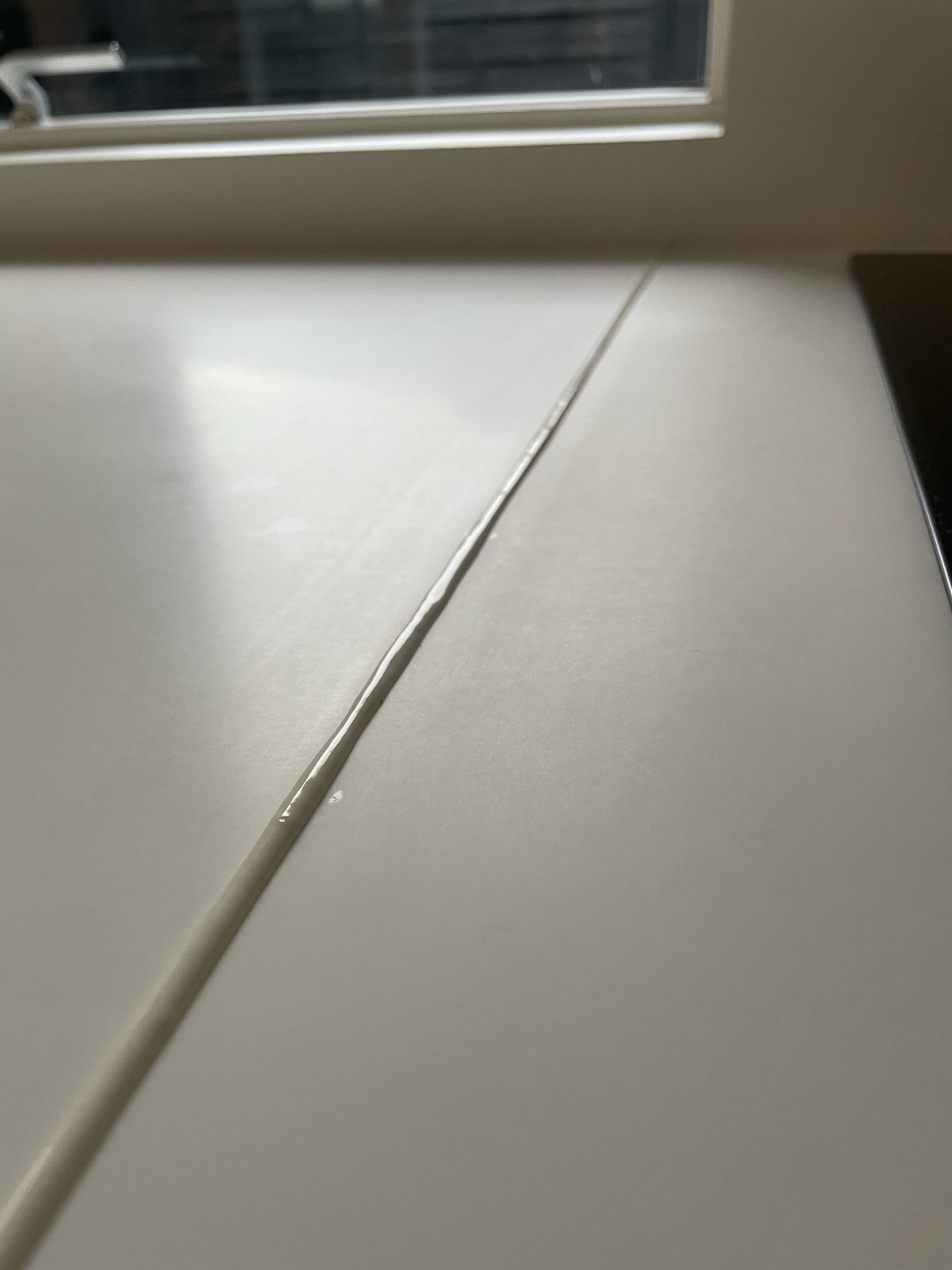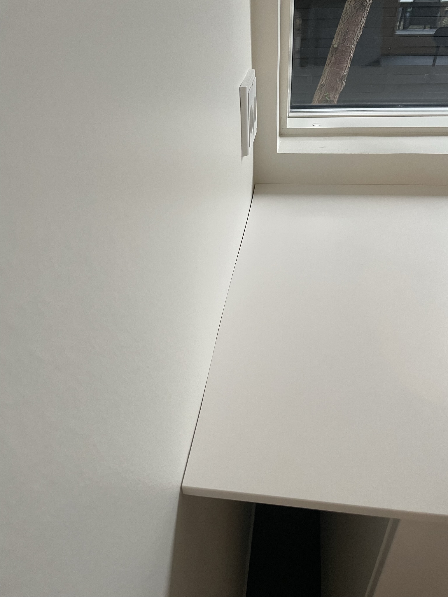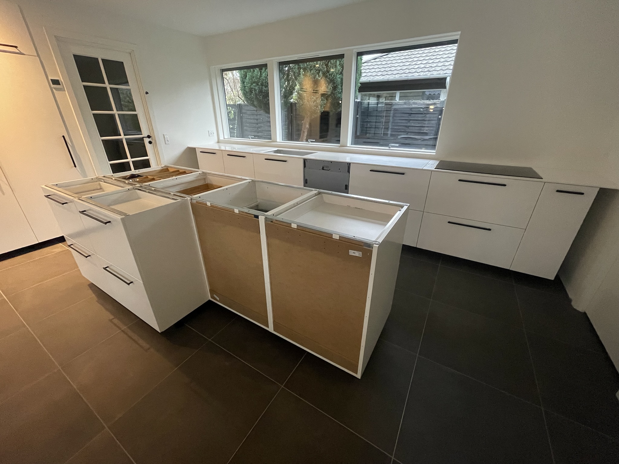 Bordplader til køkkenet består af en bordplade "væg-til-væg" på ca. 4,80 meter og en køkkenø med vandfald/endegavle (2 stk.) samt siddeplads.
